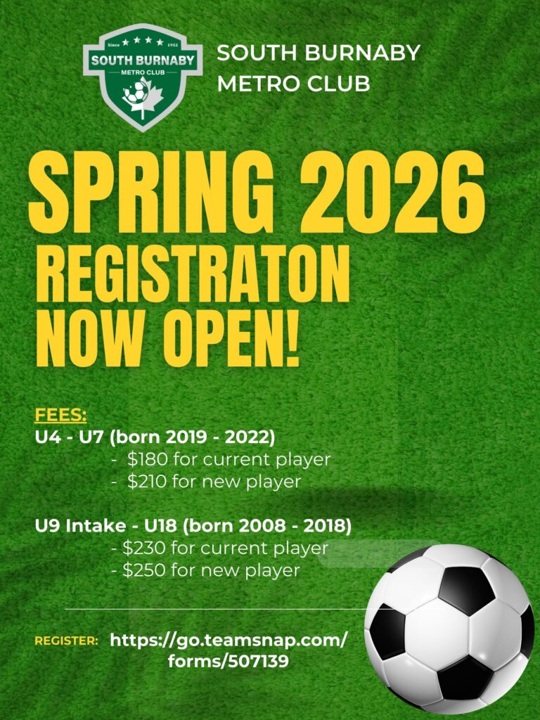 Elevate your game this spring! We are thrilled to announce that registration is now officially open for the South Burnaby Metro Club Spring 2026 Academy. Designed for players looking to sharpen their skills and stay active, our Academy sessions focus on technical development in a high-energy environment under the lights. Program Details: Location: Byrne Creek…
